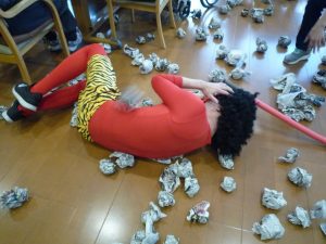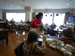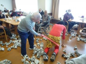 利用者様には豆の代わりに新聞紙をしっかりと丸めて頂き、鬼退治の準備は万全!鬼が来るのを「まだか?まだか?」と心待ちにされていました。
