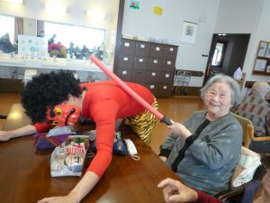 豆をまくだけでなく、鬼の金棒で利用者様に鬼を退治をして頂きました。「スポーン」と響く音に「わ~」と歓声が上がり盛り上がりました。