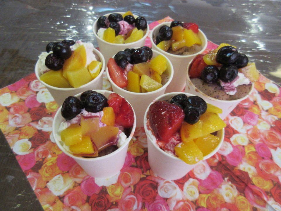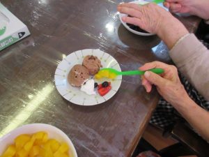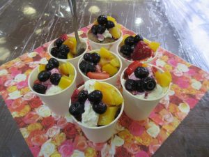 カップから取り出し、食べやすい大きさにカットしたらお皿に盛りつけ、生クリーム・フルーツをトッピングしていただきました。