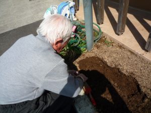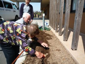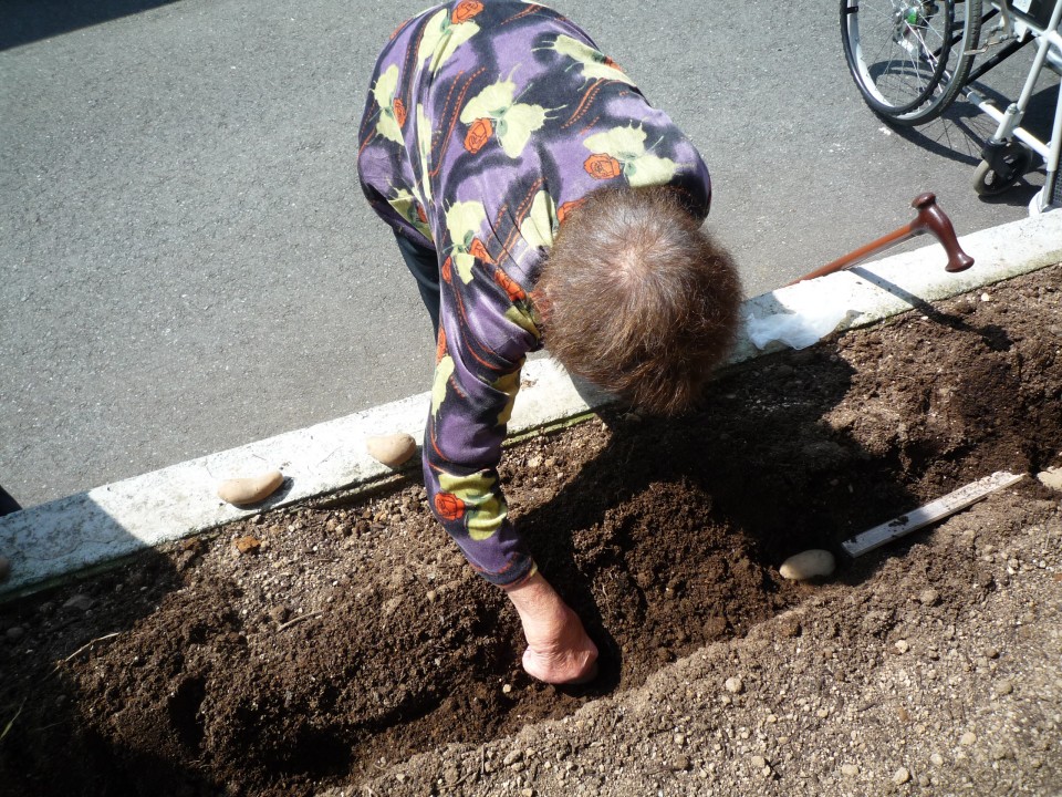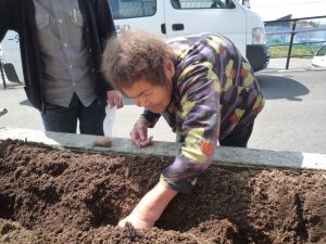 「間隔はこれぐらいでよかな?」と声をかけ合いながら、深く掘った土の中にひとつひとつ種いもを植えていかれました。