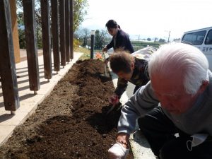 植えた後は、土をかぶせ畝を作り、皆で協力して黒マルチ張り!