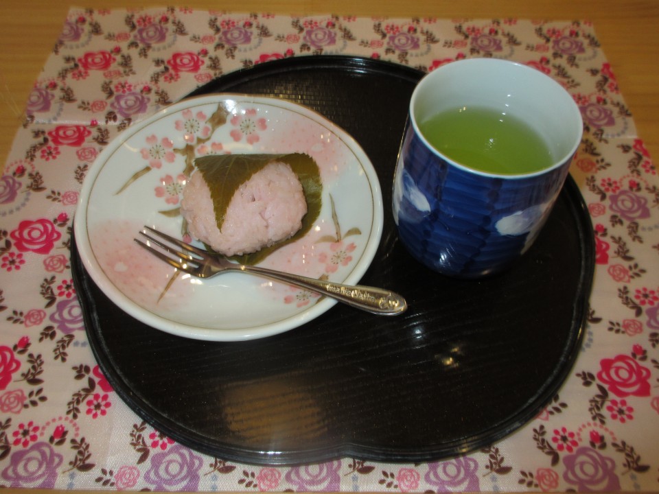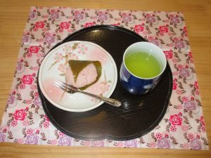 次に丸めたもち米を薄く伸ばし、その中に餡子を入れて桜の葉で巻いて…完成です!