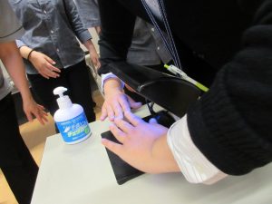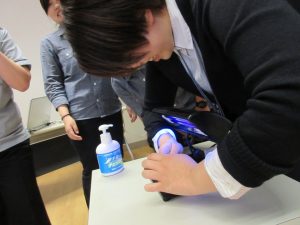 感染症予防の基本は手洗いです。手洗いチェッカーを使用し、手洗い後に洗い残し部分のチェックを行います。