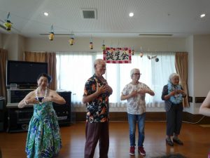 7月の誕生日の方にはレイを首にかけて頂き、皆でお祝いをしました。誕生日カードをお渡しすると、涙を浮かべながら喜ばれていました。