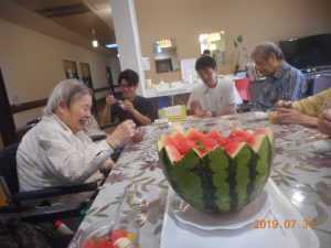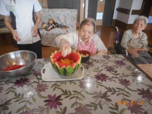 みなさんで団子をこねたり、スイカをくり抜いて盛り付けたりしました!