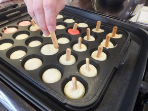 生地をたこ焼き器に1/3入れ、(きのこの傘の部分を)ゆっくり焼きます♫