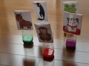 イラストを付けた色水入りのペットボトルをピンにして、指定したピンを狙って当てて頂くゲームです。