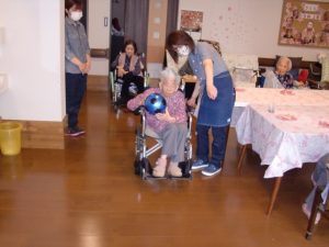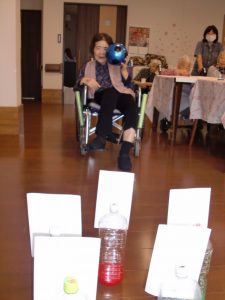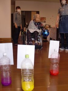 お菓子やジュースを食べられた後は、「ペットボトルボーリング」のレクレーションをしました。