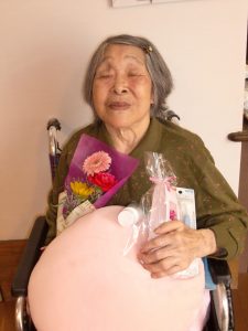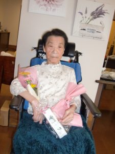 誕生会の主役のお二人にプレゼントと花束を贈呈し、参加された皆さんで「ハッピーバースデー」を歌い拍手すると、涙ぐんでおられました。