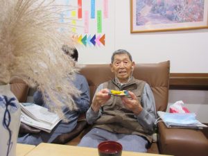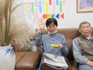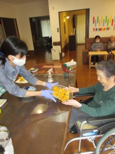 2・3人のご利用者様がじっーと見つめています。小さく丸め安全に。