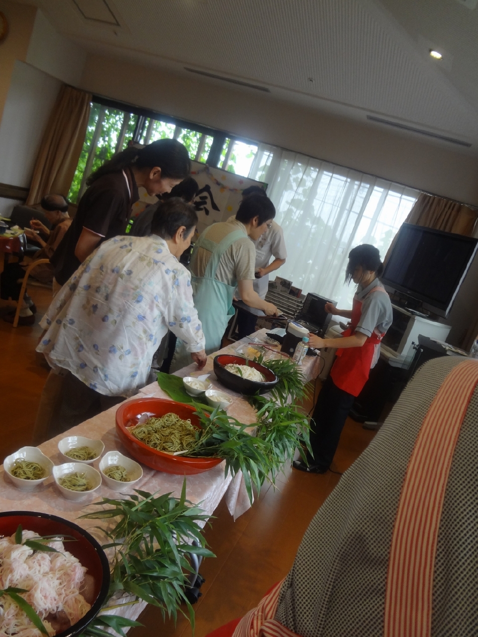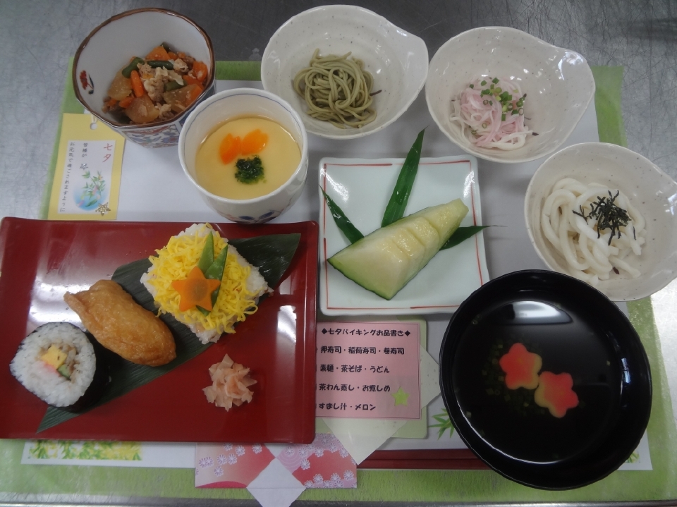 Posted in ひろやす荘七夕バイキングを開催しました☆彡2014/07/07By ひろやす荘 平成26年7月7日(月) 7月7日は七夕です☆彡 この日に合わせて、今月の通所食事イベントは《七夕バイキング》を行いました。 今回は、巻き寿司やいなり寿司、そうめん、茶そばなどの中からお好きなものを選んでいただきました。 押し寿司のトッピングは、七夕にちなんで流れ星をイメージしました☆彡 みなさん、迷われながらも思いおもいの料理を選んで行かれます。 外はあいにくのお天気でしたが、みなさん和やかにお食事を楽しんでおられました。 来月も食事イベントを計画していますので、どうぞお楽しみに・・・!!