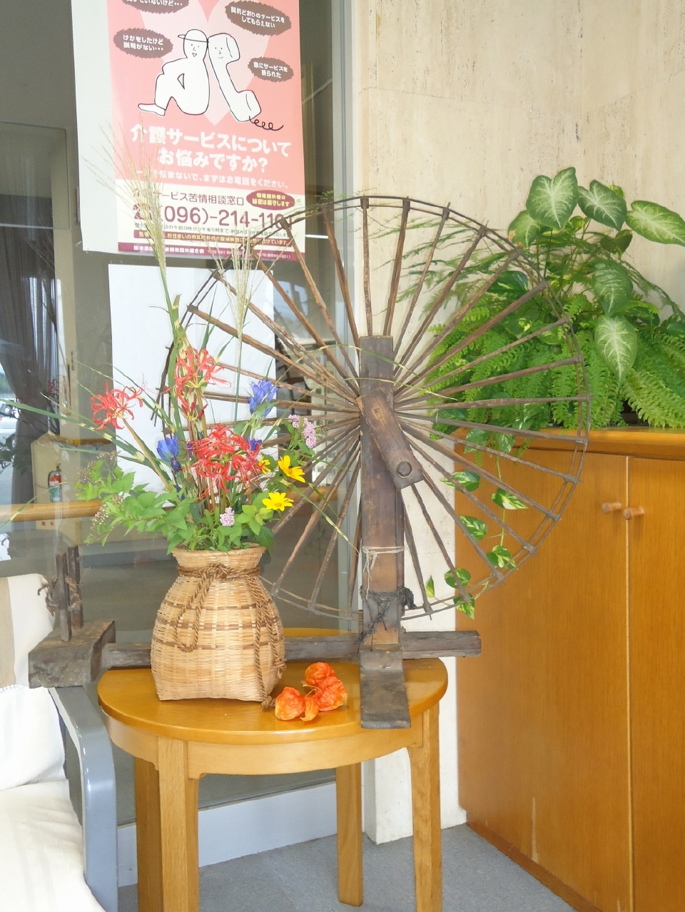 施設の玄関には、ススキやりんどう、彼岸花など花器に生けられています。