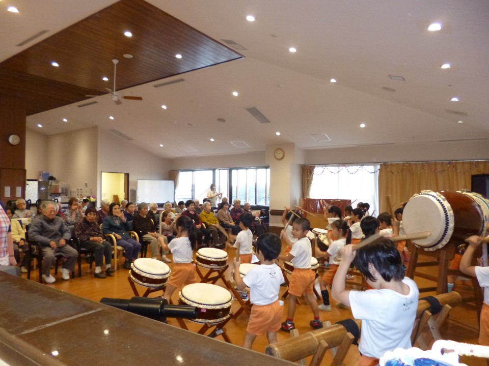 かわいい園児が来荘されると聞いて、ご利用者の皆様も午前中からワクワク!!いざ和太鼓の演奏が始まると、一緒に手拍子され笑顔でご覧になっておられました。