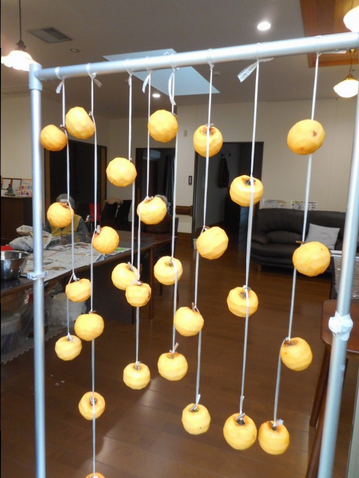 吊るした柿は天候をみながら外に出したり中に入れたり・・・カビが生えないよう柿のコンディションを確認していきます。利用者様が一生懸命作った干し柿が美味しく出来ますように(^O^)