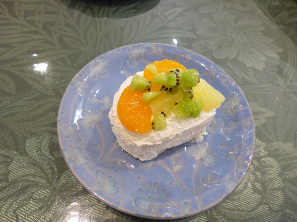 ロールケーキにホイップクリームやお好きなフルーツを盛りつけていただきました。