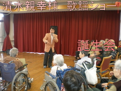 Posted in ケアポート益城4月誕生会2011/04/11By 管理者 今月は清水親幸様にお越し頂きました。毎年、楽しい歌謡ショーを披露して下さいます。美空ひばり、瀬川英子、氷川きよし等他にも沢山のレパートリーをお持ちです。あい間の声かけにも、笑いありで、今日も利用者の皆様喜んでいらっしゃいました。アンコールにまでお応え頂き、ありがとうございました。