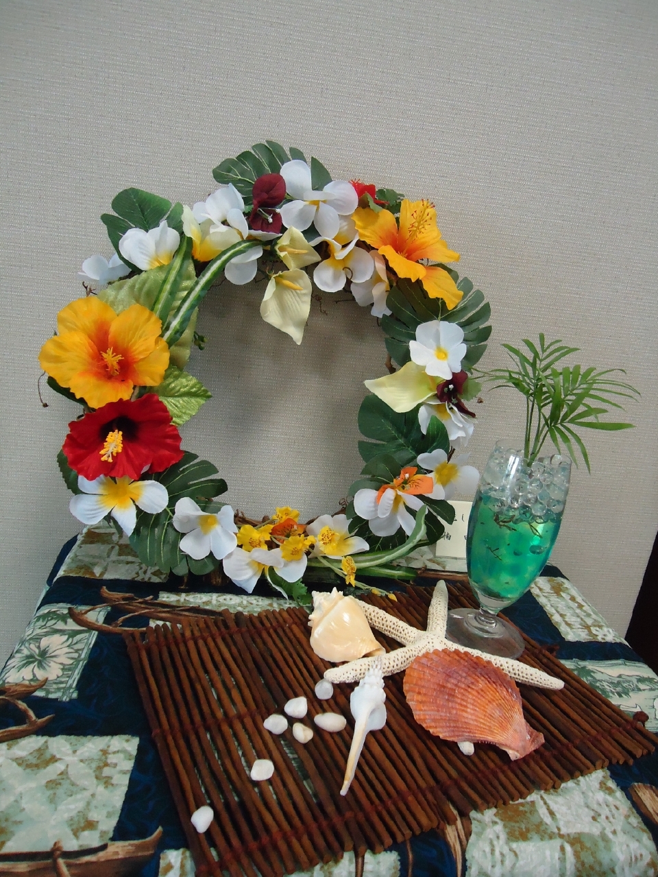 Posted in ケアポート益城南国気分!!2014/08/08By ケアポート益城 生け花ボランティア 楠田草紫先生より、レイを飾って頂きました。 先日もトロピカルな気分になりましたが、今回のレイもハイビスカスや色々な夏の花が 入り、とても綺麗です。 利用者の方も立ち止まり、眺めていらっしゃいました。 有難うございました。