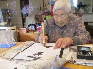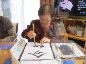 だご長寿の尊さをより実感していただけたら」、との願いを込めて、スタッフと一緒に書初めしました。