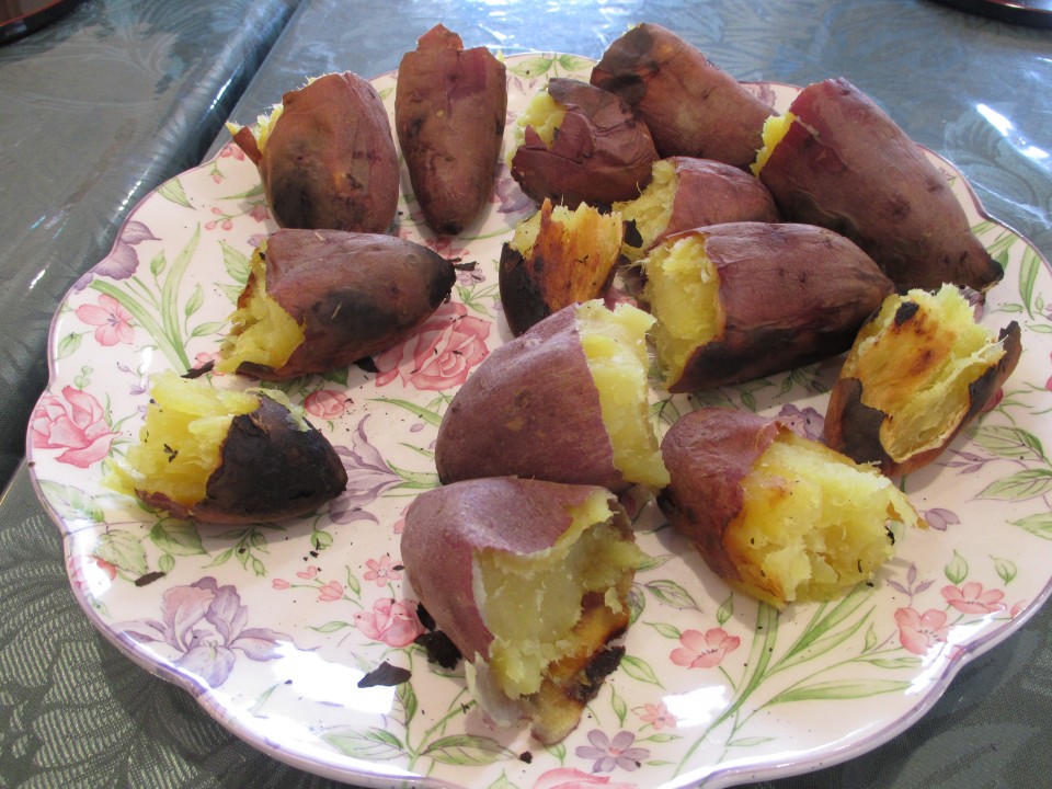 すっかり焼き上がって美味しそうな匂いを漂わせているホクホク焼き芋と、