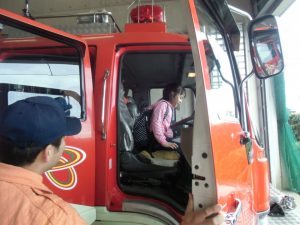 益城西原消防署のご協力にて子供たちの大好きな消防車や救急車の乗車体験や、震災時の写真を見学させて頂きました。