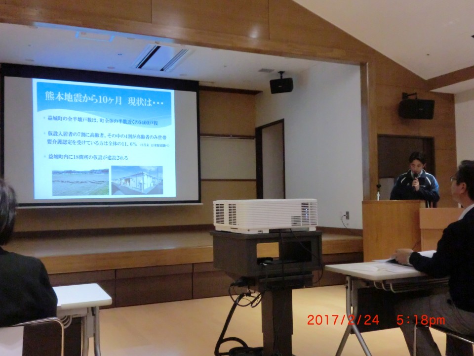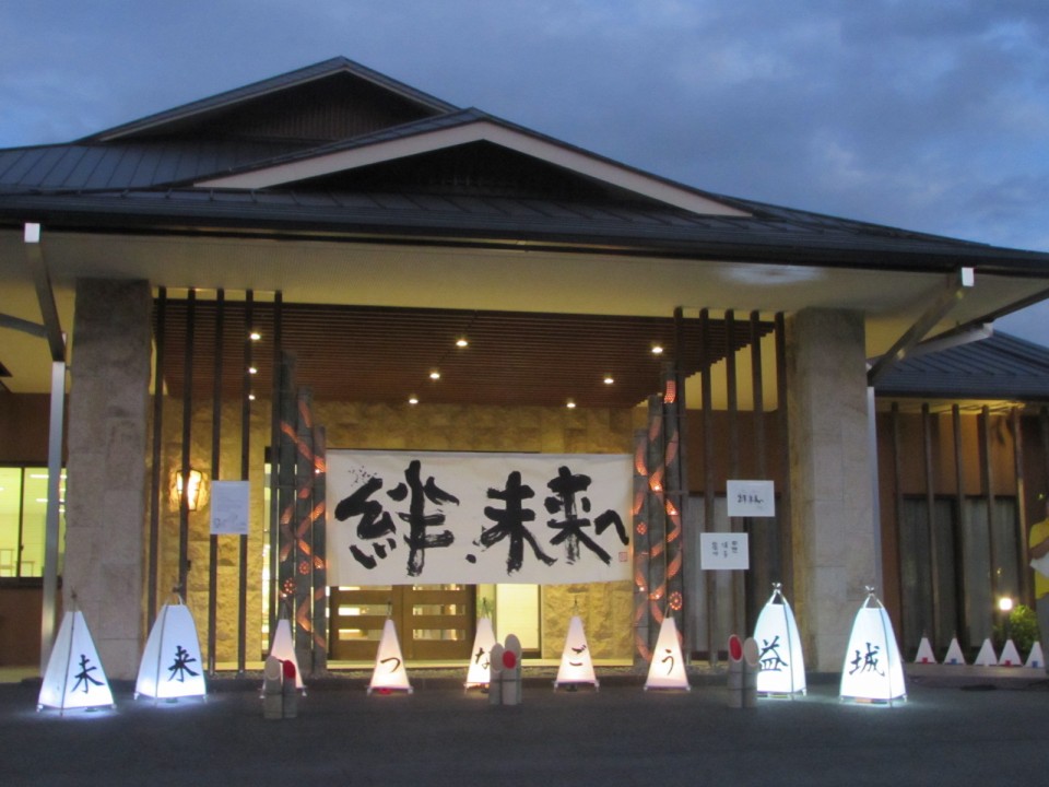 震災の姿として震度7の地震で撤去する事になったケアポート益城の建物がライトアップされ、開会に先立ち