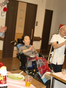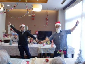職員二人でサンタの仮装をして今流行りの”パプリカ”を踊り、